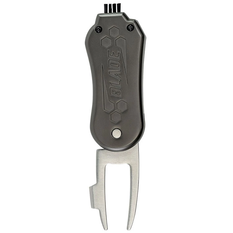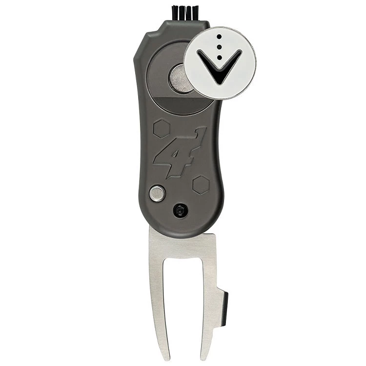 | Callaway 4 In 1 Switch Blade Divot Tool Includes Unique Club Cleaning Brush The perfect accessory for your round of golf. The Callaway 4 in 1 Switch Blade Divot Tool acts to repair pitch marks along with featuring a magnetic ball marker, soft brush, and metal groove cleaner and sharpener for tough dirt. – Made of durable zinc alloy – Pitch repair & dual-sided magnetic ball marker – Soft nylon brush for general cleaning – Metal groove cleaner & sharpener – Ergonomic shape for ease of use |