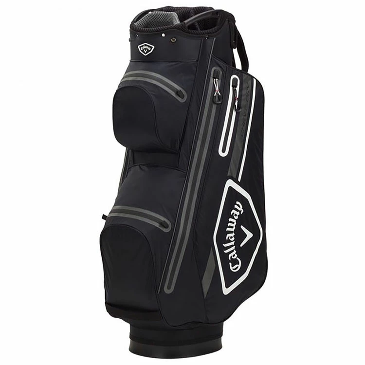 | Callaway Chev Dry 14 Golf Cart Bag Lightweight Design With Waterproof Protection A new fully waterproof lightweight trolley bag from Callaway Golf, the Chev Dry 14 Cart Bag is designed to fill all requirements the waterproof cart bag player needs with lightweight design. Featuring a new 14 way graphite friendly divider system with molded easy grab handles, the Chev Dry 14 Cart bag offers exceptional club organisation while the ‘E’ trolley friendly base allows the bag to fit perfectly on either pull or electric trolleys. The bag features 7 fully waterproof pockets which include and range of valuables pockets, accessory pockets, full length pockets & more. An extremely well designed bag with designated top divider putter section, umbrella loop, glove attachment and grab handle. The Callaway Chev Dry 14 Cart Bag is a stylish and functional waterproof cart bag. |