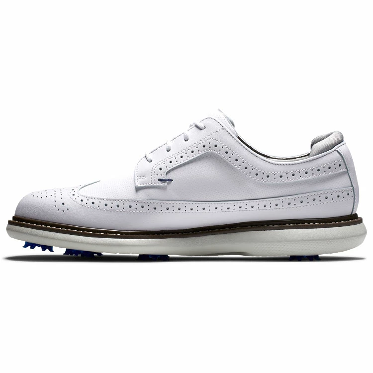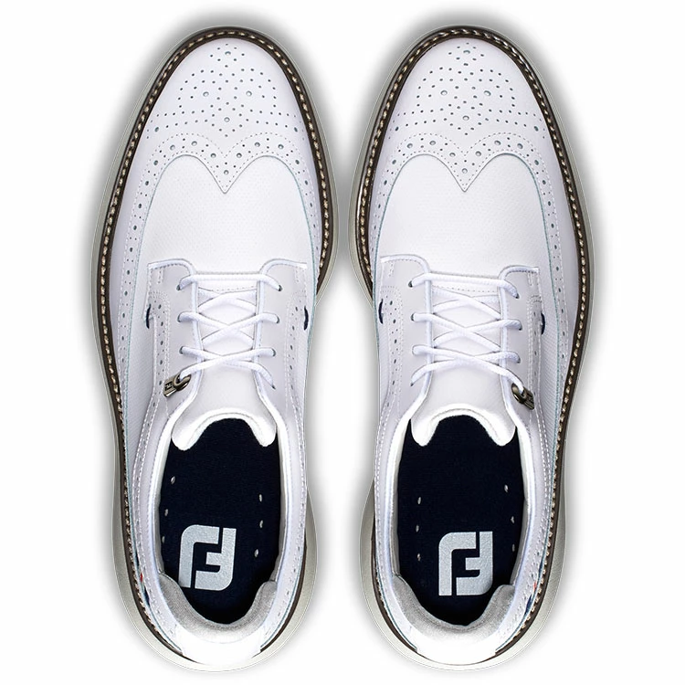 | FootJoy FJ Traditions 57910 Golf Shoes All Day Comfort In A Modern Classic Style FootJoy FJ Traditions offer complete traction and can be easily maintained round after round. Lightweight comfort and super-cushioned foam deliver an incredibly flexible and comfortable ride. The super-cushioned foam underfoot will keep you comfortable and supported throughout the entire round, and built in achilles pad ensures a perfect no-slip fit. 100% waterproof, a full grain leather provides a soft and easy to clean upper with 1 year waterproof protection. For traction, Pulsar LP cleats by Softspikes offer renewable grip on the course and the 7-cleat configuration provides a high level of traction points for even more grip. Clean and iconic, the FJ Traditions Golf Shoes offer the perfect blend of classic design with modern performance. |