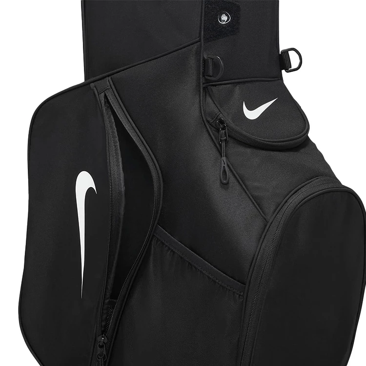 | Nike Air Sport 2 Golf Stand Bag Fully Loaded With All Premium Features The Nike Air Sport 2 Stand Bag is equipped with an EquaFlex Max Air double strap system for comfortable hauling, and 9 functional pockets help keep essential equipment organised on the course. Featuring a 4-way divider for keeping your clubs in order and the Nike EquaFlex dual strap system with a ventilated air mesh back pad for extra comfort when carrying. A water resistant, fleece lined pocket protects your valuables, while an insulated cooler bottle pocket provides easy access storage for food and beverages, plus scorecard and pencil pockets to keep you organised. The Air Sport 2 now features utility webbing for convenience, new custom grip leg end caps for stability when standing and the matching rain hood is included for protection from the elements. |