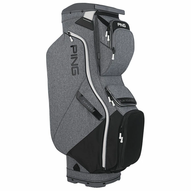 | Ping Traverse 214 Golf Cart Bag Practical Features With A Lightweight Design Style, efficiency, convenience, and versatility combine to make the lightweight but strong Traverse bag a great companion to your round. Now re-designed to be even lighter at 2.5Kg, Ping’s lightest cart bag has two large wells for oversized grips in the 14-way top. It features 11 pockets, including two new outer magnetic slip pockets, full length apparel pockets and a velour-lined valuables pocket. The bag has an integrated soft-moulded, front-facing lift handle optimizes manoeuvrability. A cart-strap pass-through channel keeps the pockets accessible and the moulded cross-design bottom fits securely on motorized and pull carts. |