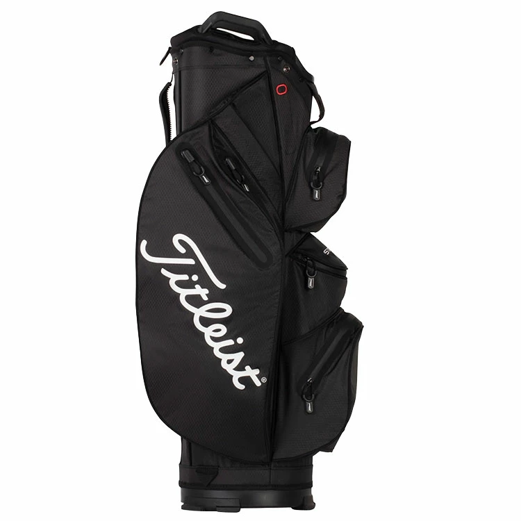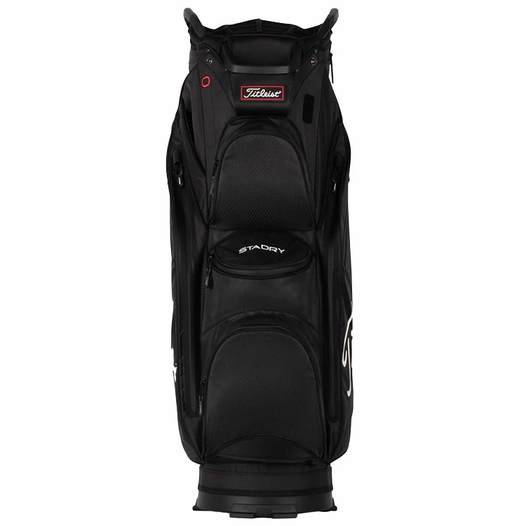 | Titleist 2022 StaDry 14 Golf Cart Bag Fully Waterproof With Maximum Storage A premium performer from Titleist, the StaDry 14 Cart Bag is the ideal choice for the player who most often uses a golf trolley and is looking for a fully waterproof design. It works exceptionally well on an electric trolley or with a push/pull trolley. Featuring 7 zippered pockets that are all accessible while the golf bag is on the trolley. These include apparel pockets, valuables pocket, accessory pockets & more. With a new integrated putter well ideal for easy access to the most used club in the bag. Other key features include a club & graphite friendly 14 way divider top which not only protects your clubs but gives exceptional organisation for the bag. Constructed from waterproof seam-sealed StaDry material, the bag is 100% waterproof. |