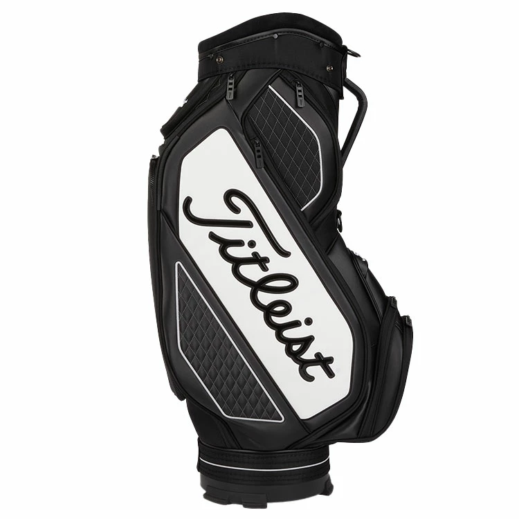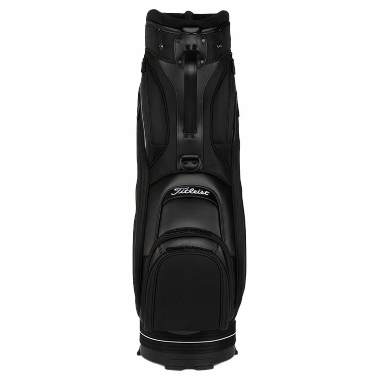 | Titleist Tour Series Midsize Staff Golf Cart Bag Tour Inspired Look With Luxurious Detailing A new introduction from Titleist, the Tour Series Midsize Staff Cart Bag is the ideal choice for the player looking for a cart bag with a staff tour bag look. Part of the new Jet Black Collection, the bag fits perfectly on a motorized trolley or with a push/pull trolley and features 11 zippered pockets that are all accessible while the golf bag is on the trolley. The moulded base includes a trolley slot for extra stability during use. Other key features include a club & graphite friendly velour 6 way divider top which not only protects your clubs but gives exceptional organisation for the bag. With a two large apparel pockets, valuables pockets & more, the Titleist Jet Black Midsize Staff cart bag is the ultimate in tour bag looks for the trolley golfer. |