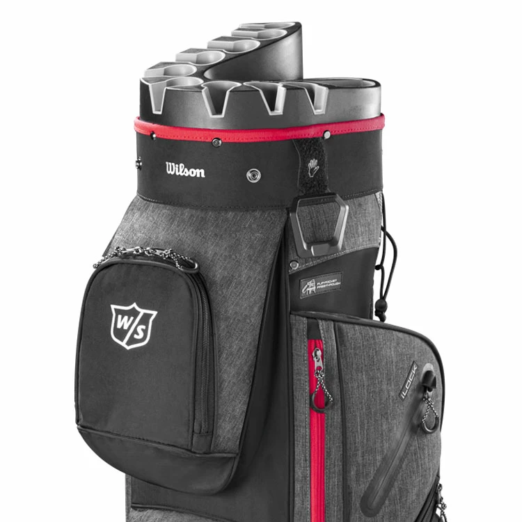 | Wilson iLock Golf Cart Bag Spacious Size With Innovative Organised Top The new Wilson iLock cart bag has a premium, modern design featuring the iLock top for the very best club organisation. The iLock bag features a 14 way top locking divider with some full length dividers, enlarged putter section for thicker grips. There is a range of 7 pockets, including two valuables pocket to keep your belongings dry along with a large cooler pocket for your food and drinks. With welded zippers and trolley base anchor, the iLock Cart bag is a premium performer for the serious golfer looking for the best bag organisation. |