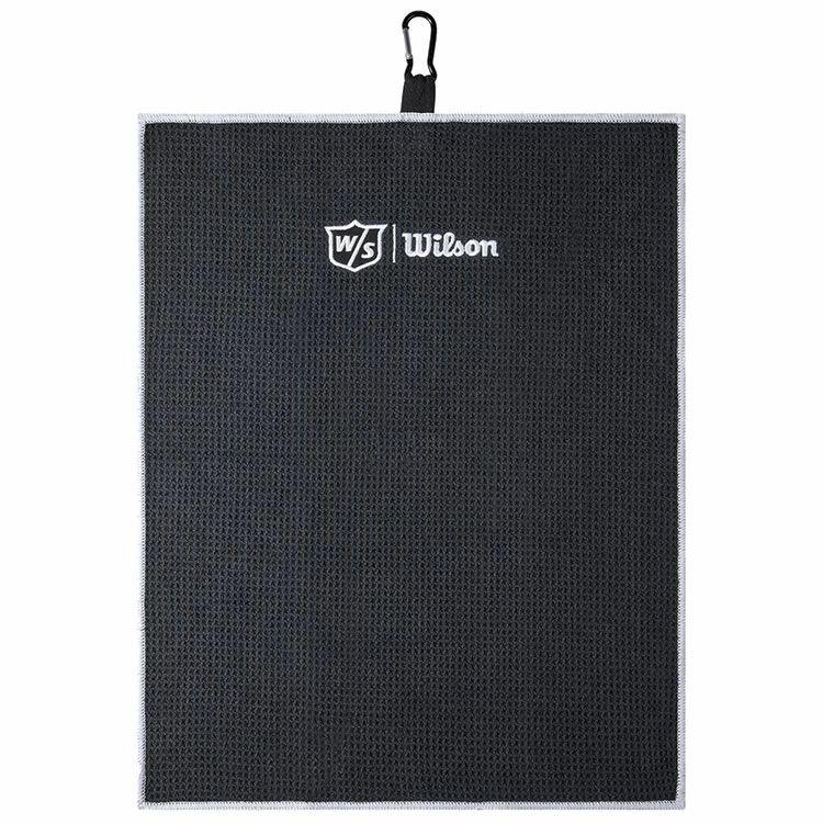 | Wilson Tri-Fold Golf Towel Greater Absorbency With Waffle Texture The Wilson Tri-Fold Towel is perfect for the golfer wanting a smaller clip on bag towel, made from 100% sheared cotton velour, that provides value and durablity. – Standard 16″x 21″ – Sheared 100% cotton velour – Provides value and durability – Features carabiner attachment system |